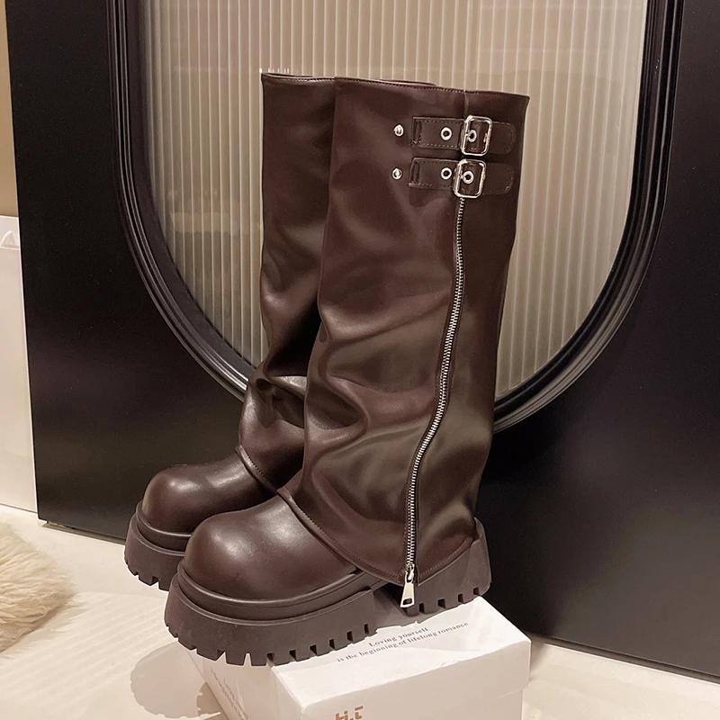 Vintage Damen Kniehohe Stiefel Mode Plateau Dicke Absatzschuhe Damen Prägnante Lange Botas De Mujer