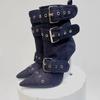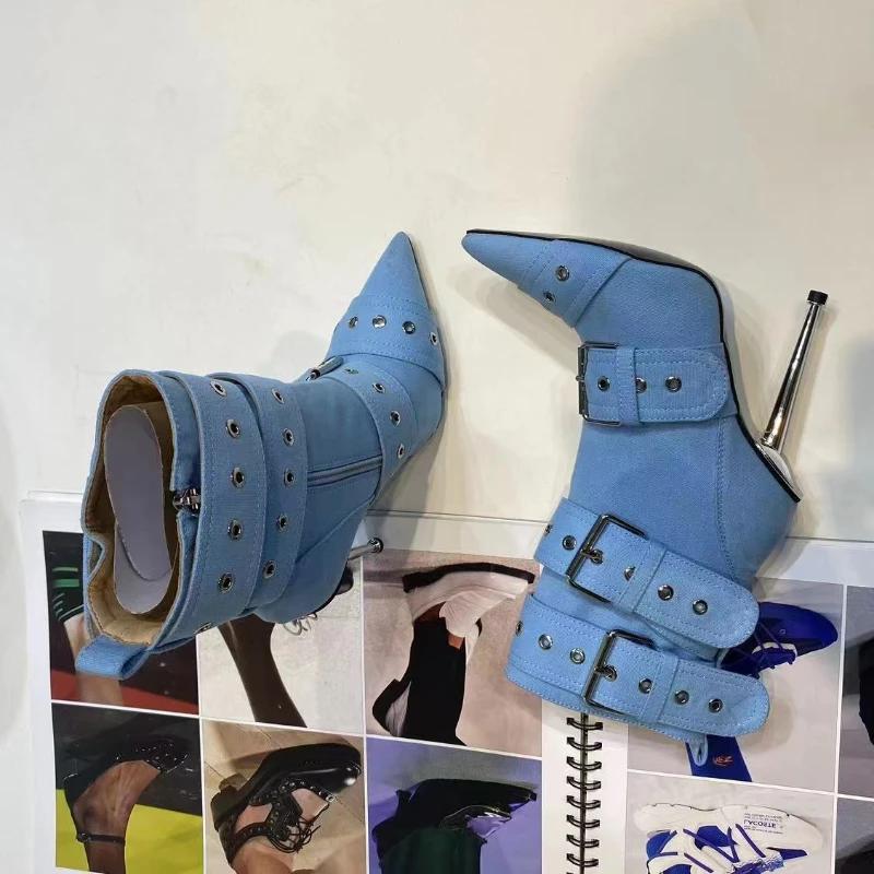 Mode Denim Metallnieten Gürtelschnalle Silber Schwarz Kurze Stiefel Damen Sexy Punk Stil Spitz 12cm Hochhackige Halbwadenstiefel Größe 34-43