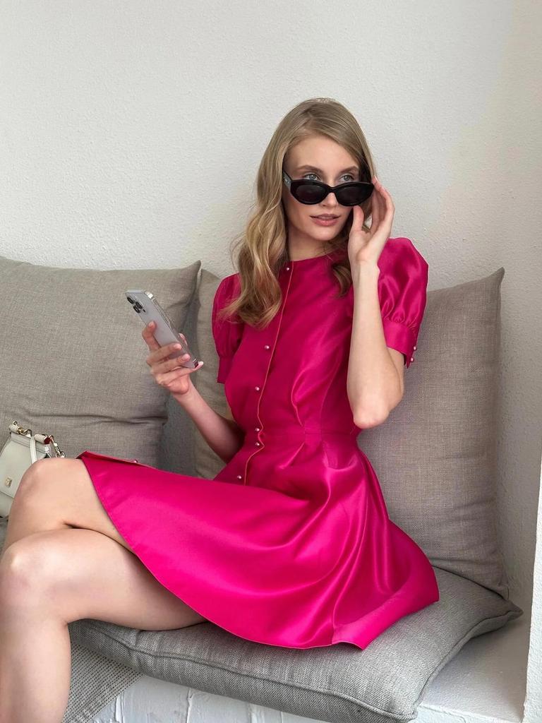 Europäischer & Amerikanischer Stil Geraffte Taille A-Linien Midi-Kleid mit Rundhalsausschnitt Puffkurzärmeln & Perlenknöpfen für Damen