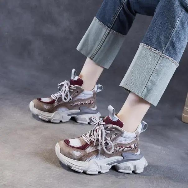6CM Plateau Frühling Herbst Hohl Damen Bequeme Schuhe Air Mesh Echtes Leder Klobige Sneaker Sandalen Vulkanisiert Atmungsaktiv Slipper