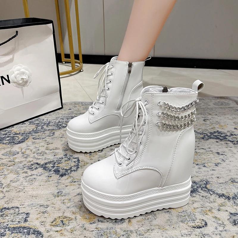 Mode 12CM Neue Damen Stiefeletten Leder Dicke Sohle Motorradstiefel Weiblich Herbst Frühling Kette Hohe Plateau Schuhe Frau Große Größe 42