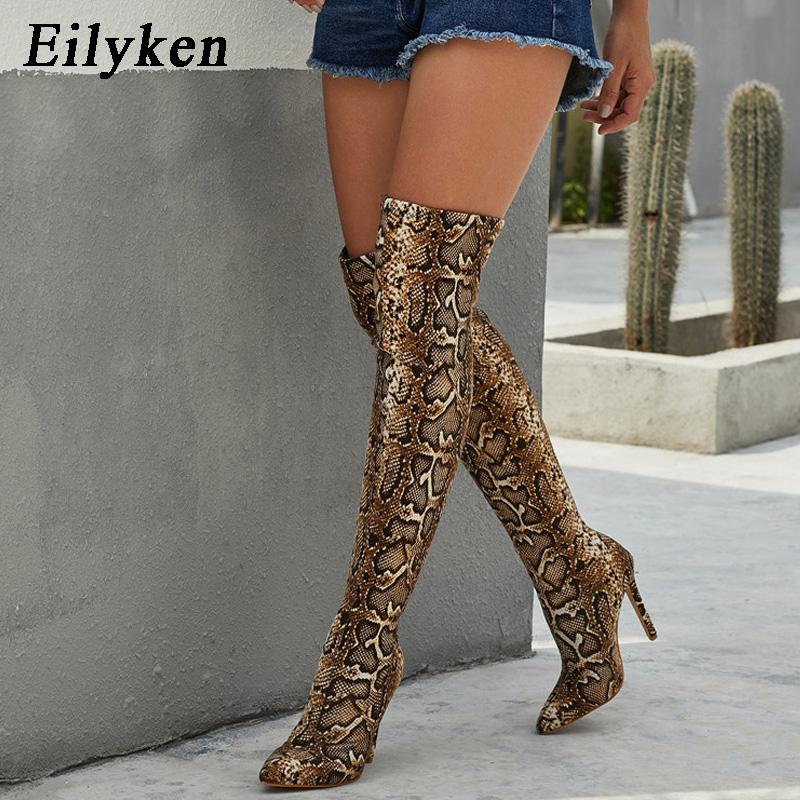 Mode Eilyken Leopard Grain Serpentine Lange Stiefel Damen High Heel Stiefel Spitze Zehen Sexy Clubschuhe Oberschenkelhoch Overknee Stiefeletten