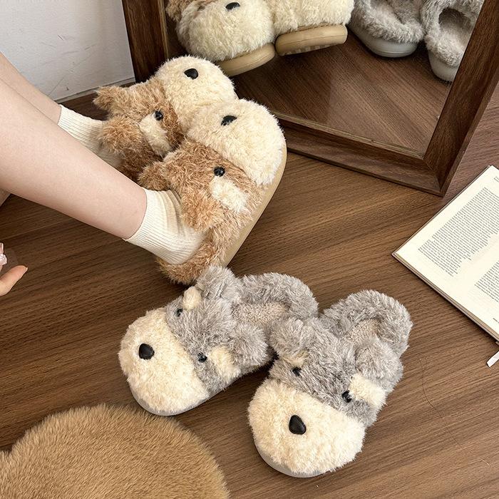 Niedliche gekritzelte Welpen flauschige Hausschuhe Damenbekleidung 2025 Herbst und Winter neu ins Wind vielseitig rutschfest Taschenkopf Hausschuhe