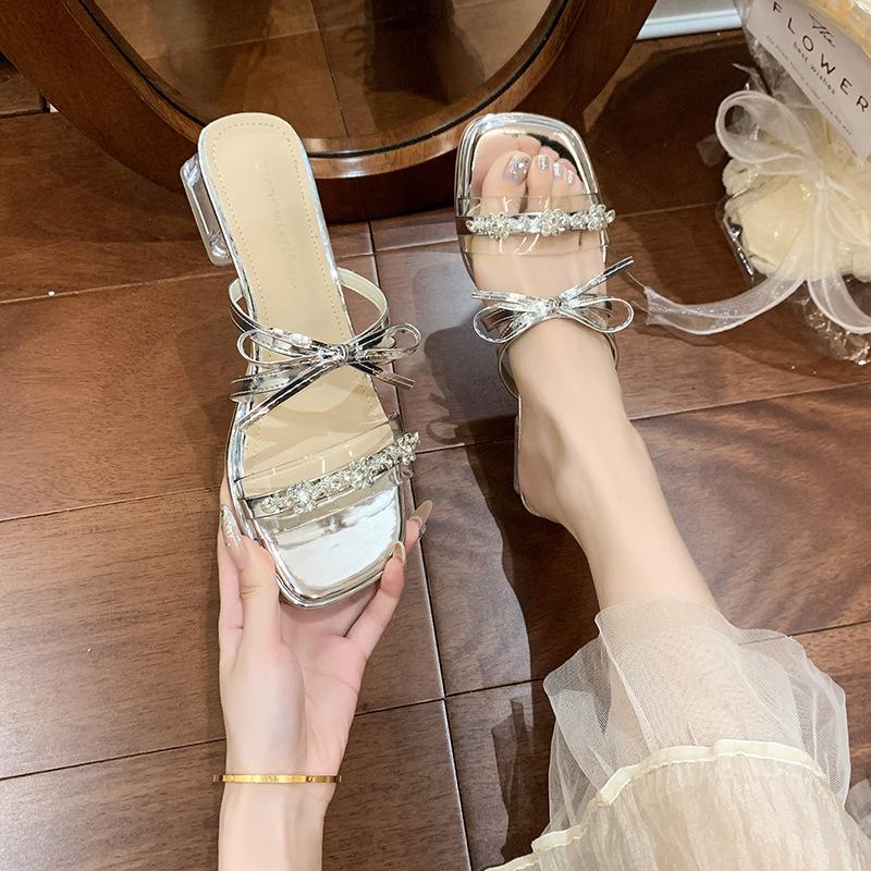 Französische Mode Dicke Ferse Coole Pantoletten Damen Sommerkleidung 2025 Neue Silberne Sandalen Schleife Strass Hohe Absätze