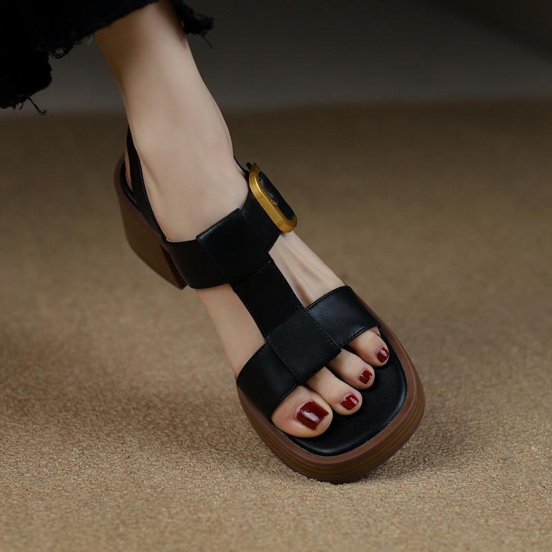 Britischer Retro-Stil Ein-Wort-Sandalen Damen Sommer mittlerer Absatz 2025 neu offen Zehen Schnalle dicker Absatz Römersandalen