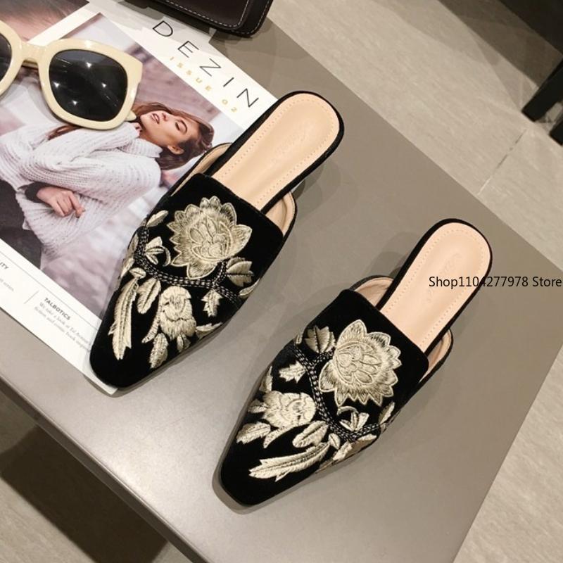 Mode Samt Stickerei Blume Pantoletten Frau Elegante Schuhe Spitz Geschlossene Zehe Hausschuhe Slipper Flats Pantoletten Damen Pantuflas Sandalen