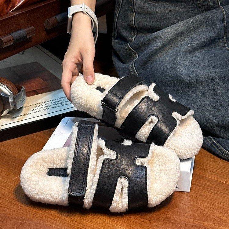 European goods 2025 autumn and winter new leather thick-soled lamb wool slippers women wear Internet celebrity flat-bottomed lazy wool slippers