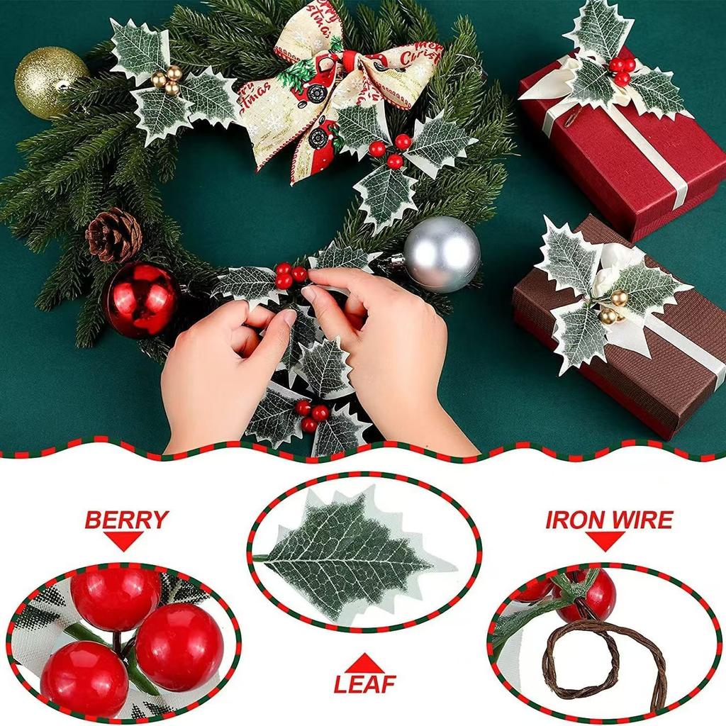 50 Stück Künstliche Stechpalmenblätter Falsche Pflanzen Grünes Blatt Rote Beeren für Weihnachtsbaum Kranzschmuck Neujahrsparty Dekor