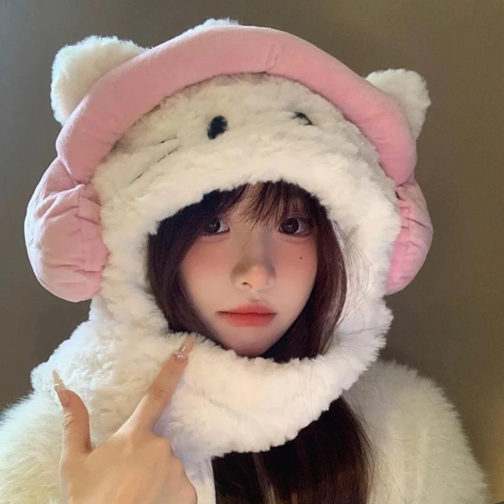 New Korean Sweet Bow Plush Bomber Cap Winter Women Keep Warm Windproof Ear Protection Cute Pom-pom Beanie with Lace