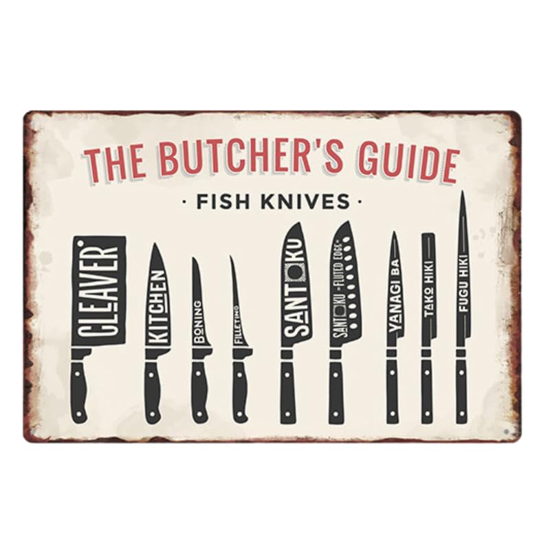 Retro Blechschild mit Fleischzuschnitten und Fischwand NYANDELMO Amerikanischer Stil Messer, 20x30cm, Dekor, Schwarz, 17, ND-0191-R04-17