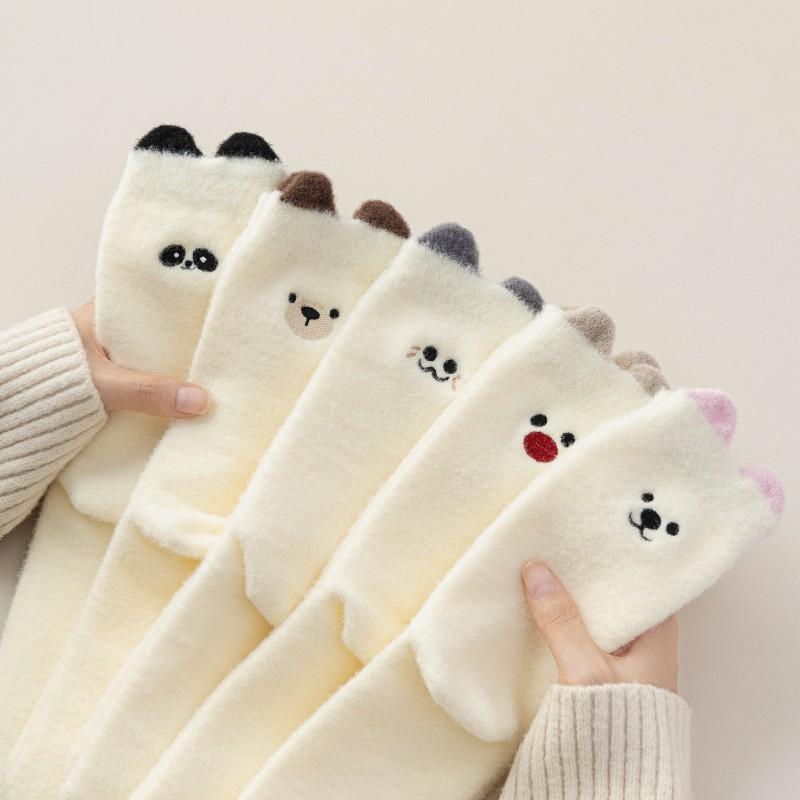 Plüschsocken für Mädchen im Winter, verdickt und bestickt, niedliche Cartoon-Mädchensocken, warmer weißer Bär, gestrickte lange Socken