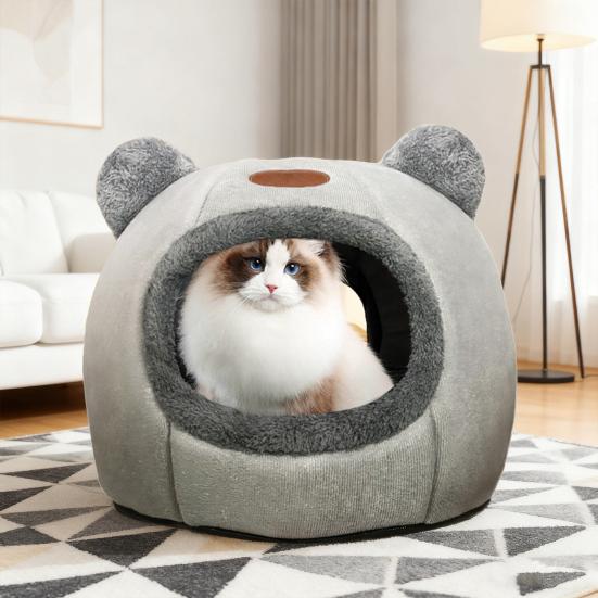 Niedliches Katzenhöhlenbett Gemütliches Haustierbett mit Bärenohren Rutschfester Boden Winterkatzennest mit herausnehmbarem waschbarem Kissen für Wohnungskatzen Welpen