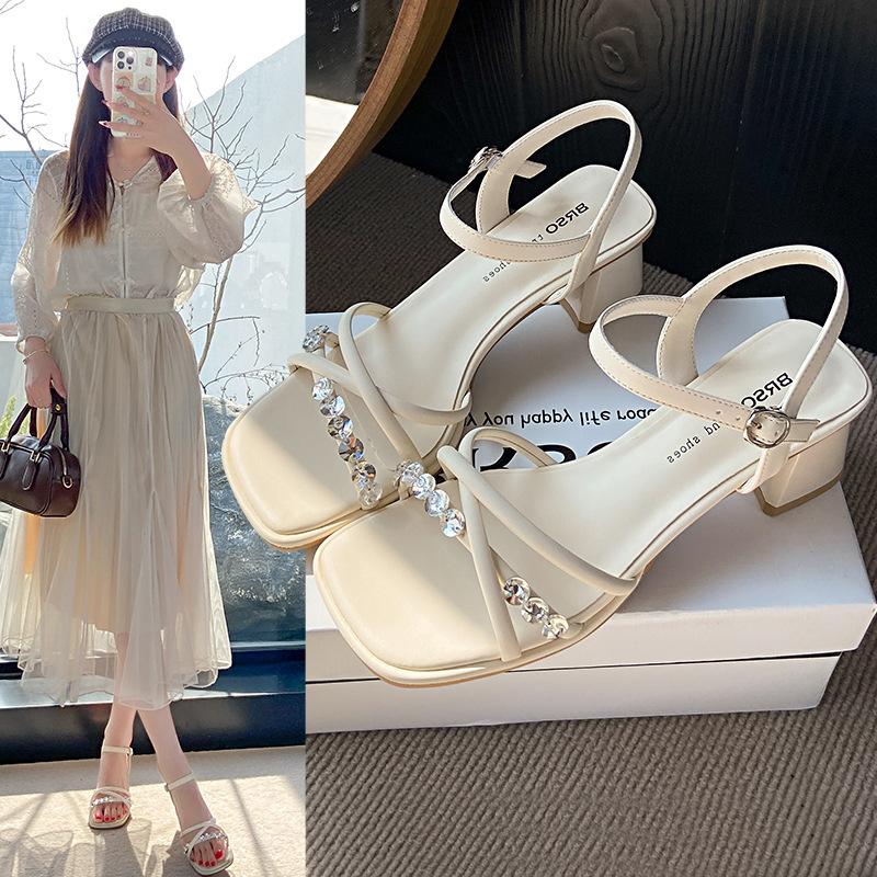 Tragen Sie mit hochwertigen Sandalen mit dickem Absatz, femininem silberfarbenem Rock mit Sommer-High Heels, Strand 2025 einwortiges eckiges Kopf-Neumodell