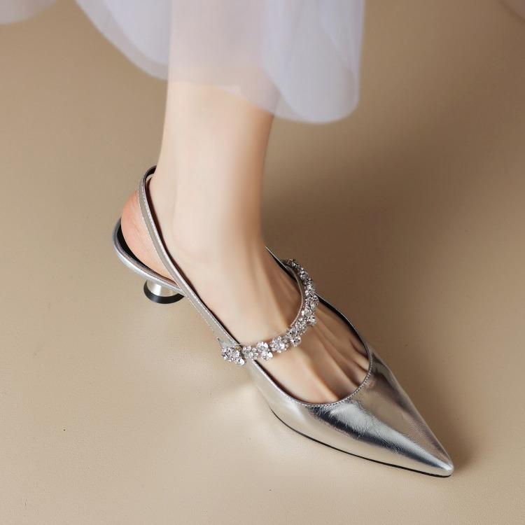 2025 Frühling und Sommer neue französische Strass weiches Leder silber spitz hinten leer Mary Jane Einzelschuhe kleiner Absatz Taschenkopf Sandalen Damen
