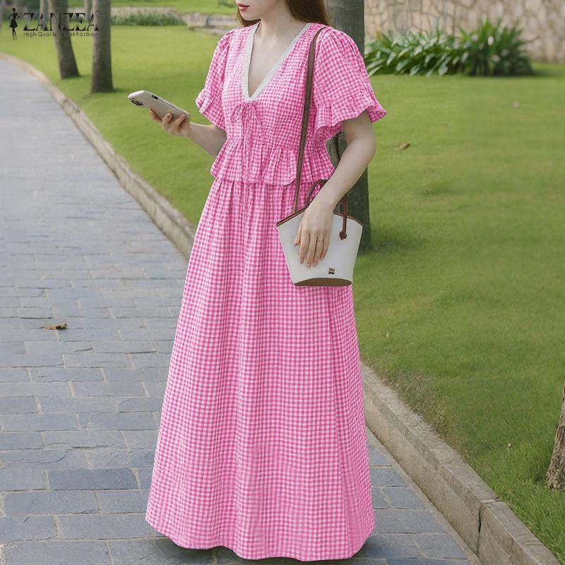 ZANZEA Women Short Sleeve Blouse and Long Skirts Plaid Print Summer Two Piece Sets