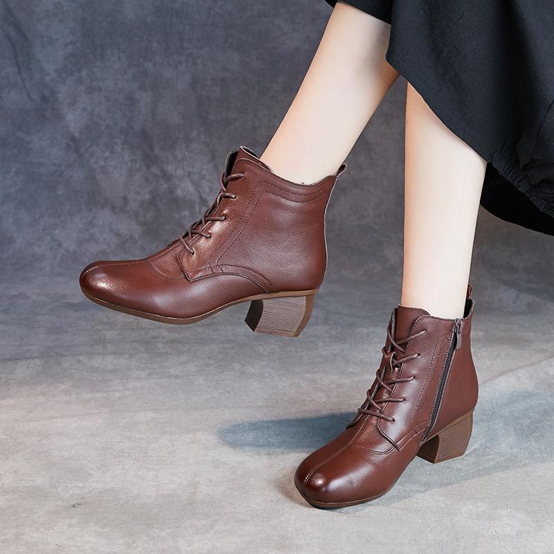 Vintage Kurze Stiefel Damen Rindsleder Absatz Mittelhoher Absatz Runde Spitze Martin Stiefel Rindsleder Hoher Absatz Seitlicher Reißverschluss Schnürstiefel Mama Stiefel