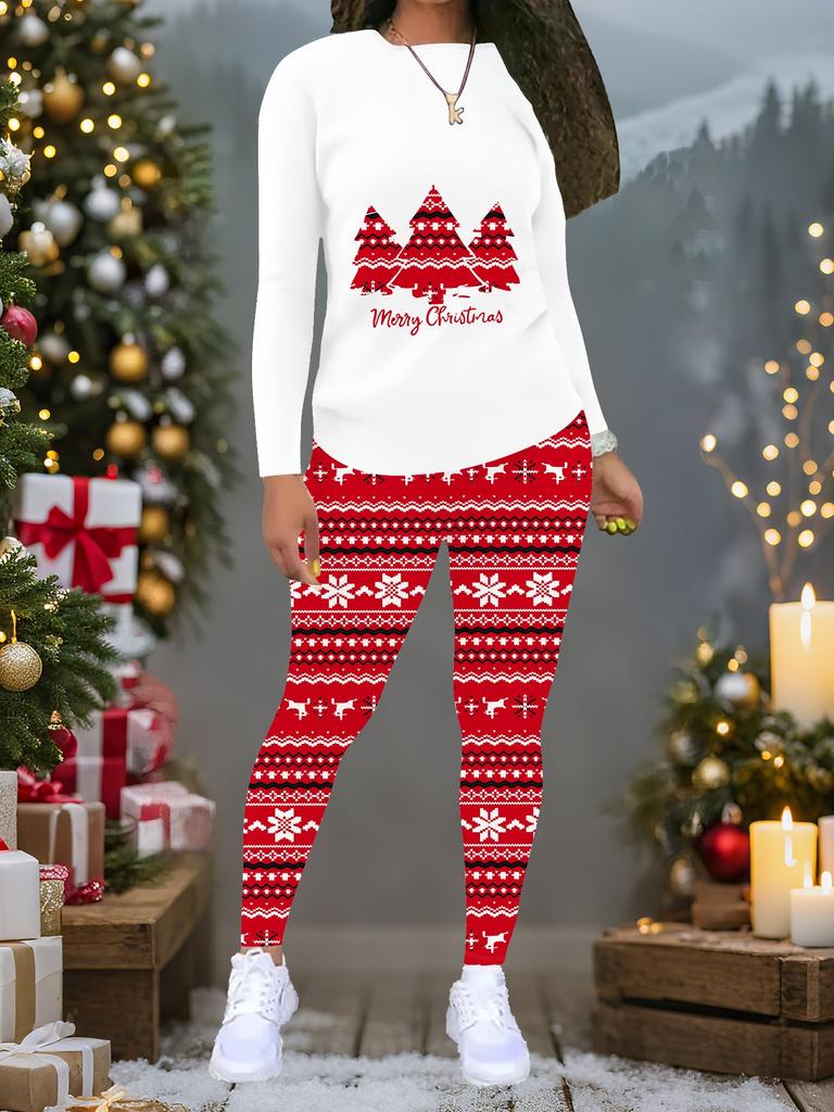 Damen Weihnachts-Print 2-teiliges Outfit: Langarmshirt mit Rundhalsausschnitt und Hose, limitiertes Freizeit-Party-Geschenkset