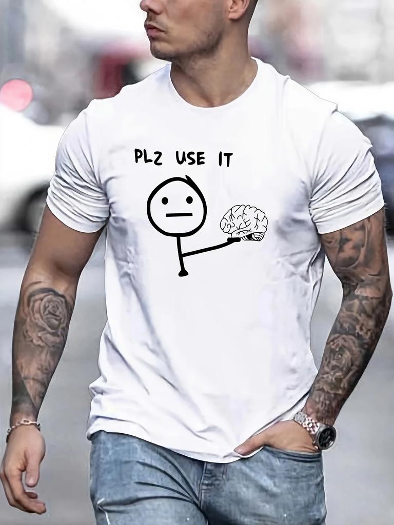 Lustiger Strichmännchen- und Gehirn-Grafikdruck Herren Kreatives Top, Lässiges Kurzarm-Rundhals-T-Shirt#Farbe(1)