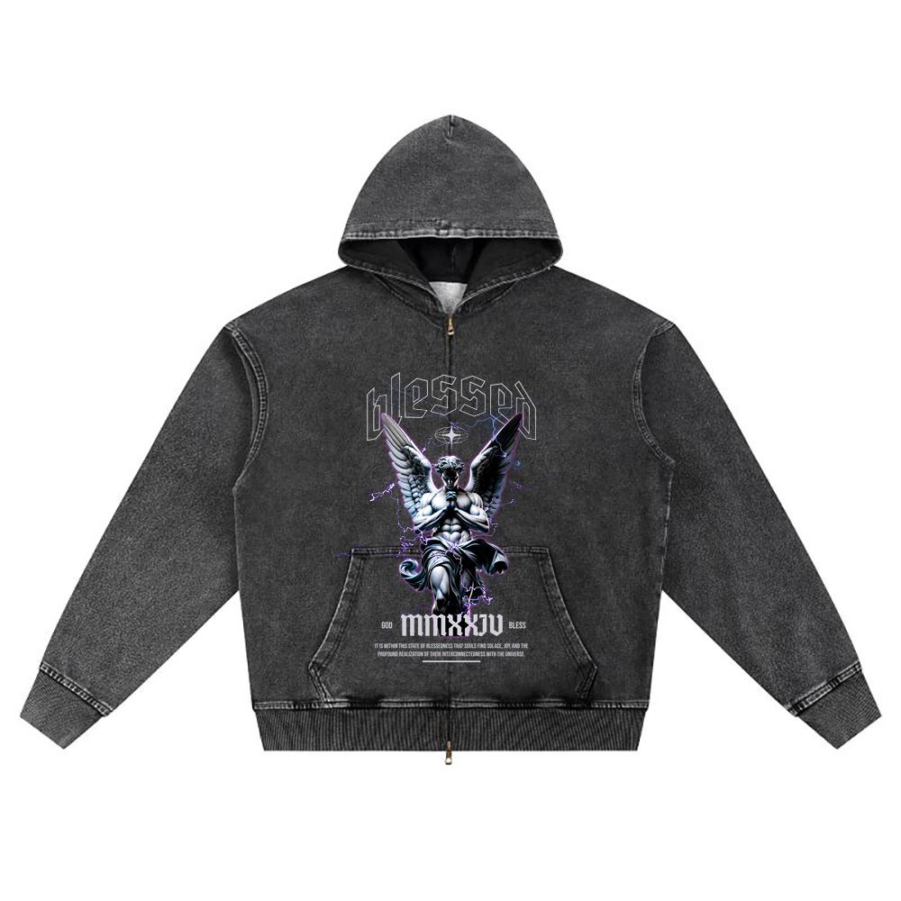 DTG-Druck Strick-Denim Zip-Up Hoodie Angel Streetwear Bruder-Print Reißverschluss-Hoodies