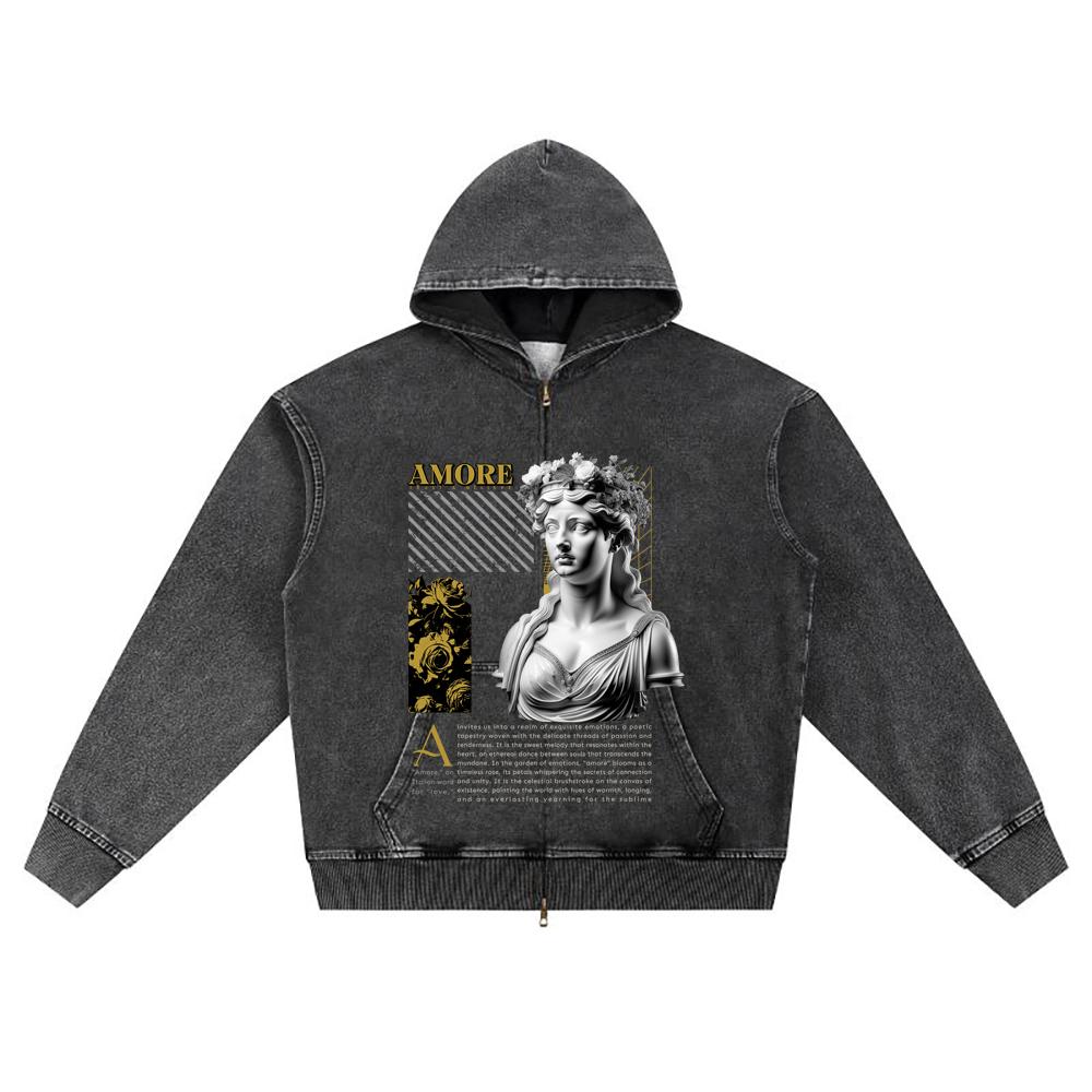 DTG-Druck Gestrickter Denim Zip-Up Hoodie Amore Brother Print Reißverschluss-Hoodies