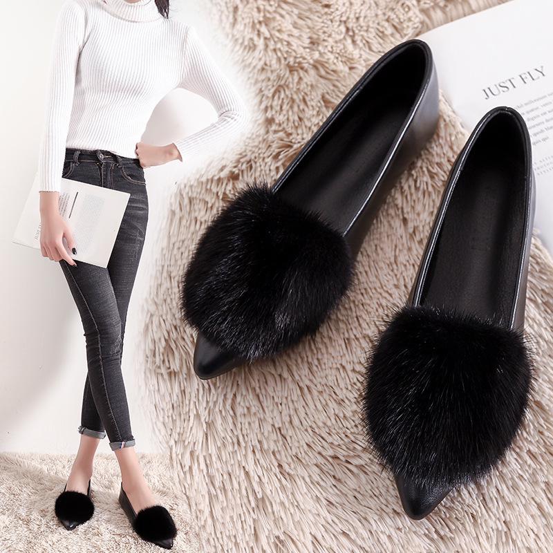 Damen 2025 Nerzfell Mokassins Loafer, Winter Samt Spitz Zehen Ballerinas, Große Größe 41