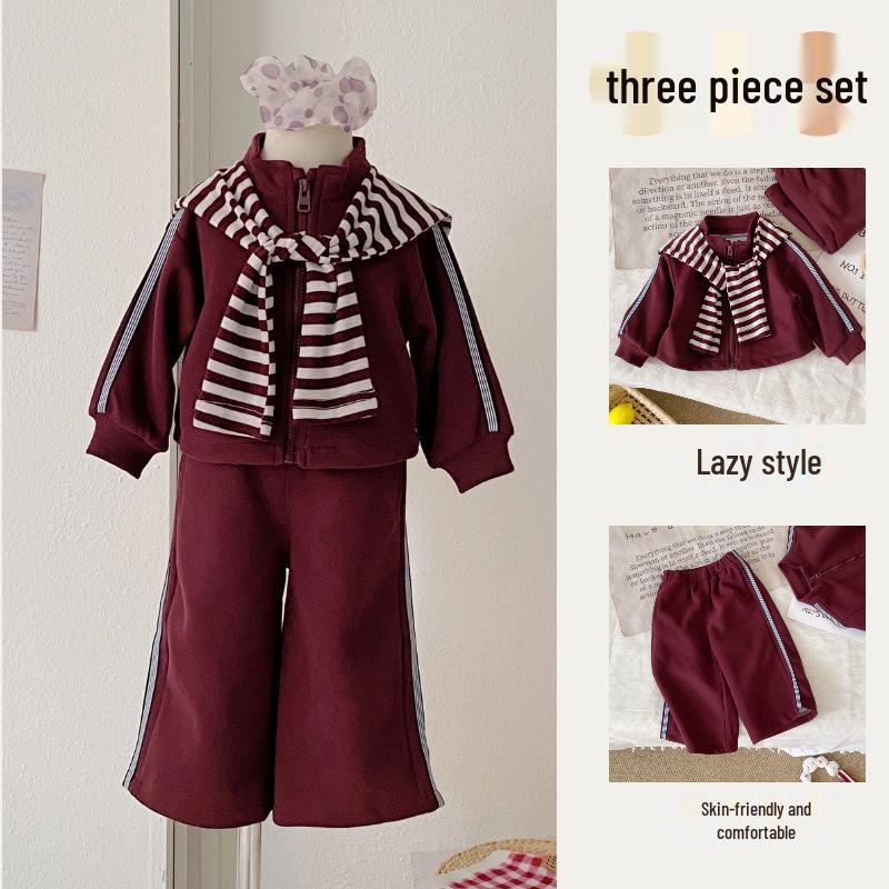 Mädchenmode Gestreifter Schal Burgunder Sweatshirt & Weitbein-Hosen Set, Herbst 2025 Kleinkind Zweiteiliges Freizeitoutfit