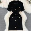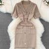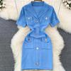 Damen Sommer Strick Polokragen Kleid mit Metallschnalle & Taschen - Weiß, Hochwertiges Designerstück