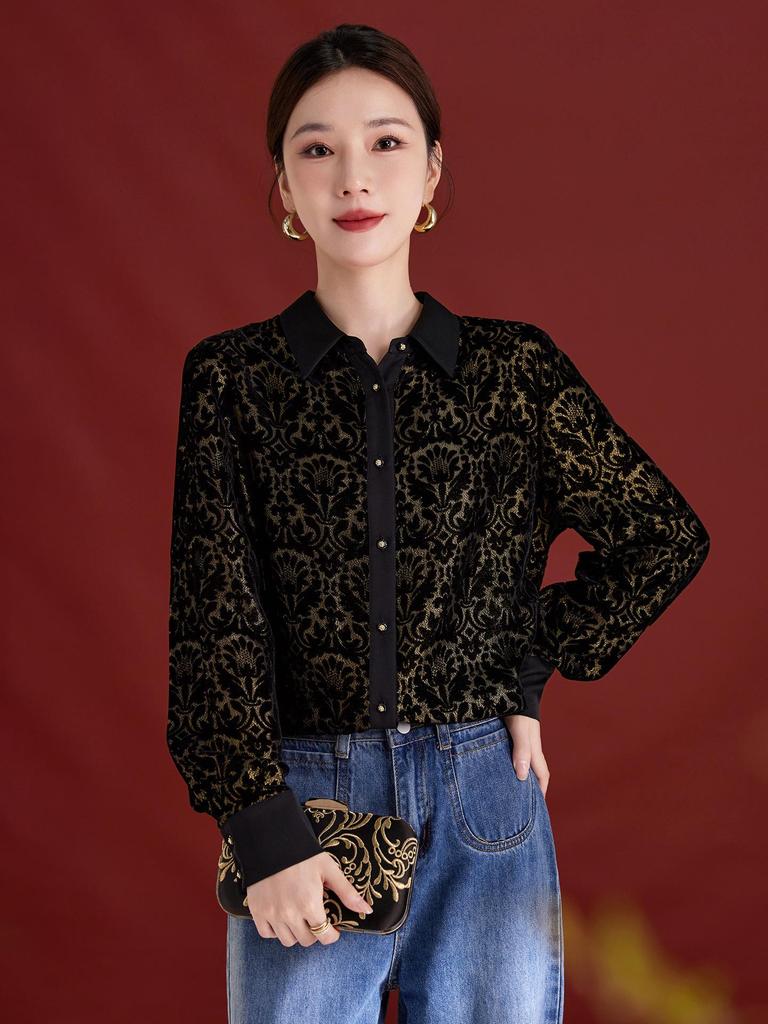 Seiden-Burnout-Samt Langarmshirt – Damen Luxusmode, Lockere Passform, Alterslos.
