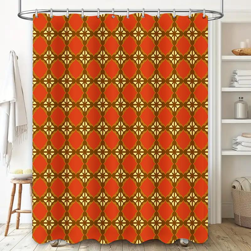 Vintage Retro Shower Curtain Geometric Floral Print Design For Bathroom Decor Home Accessories In Orange Gold Color (180 X 180Cm