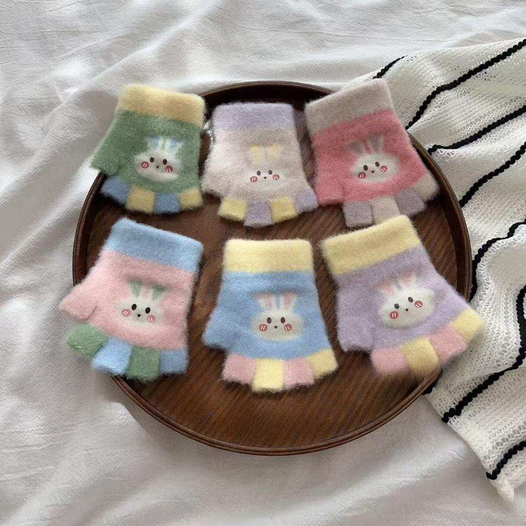 Baby Halbfingerhandschuhe Herbst und Winter Cartoon Fünffinger Farbblockierung Hase Niedlich Warm Schreiben Halbfinger