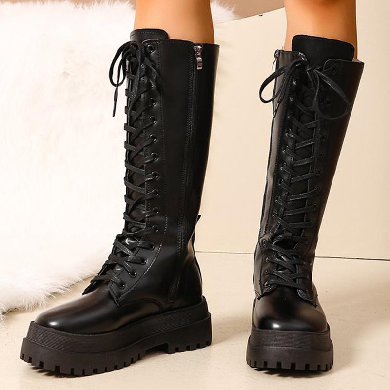 Motorcycle Thick Bottom Boots Women Spring Autumn Punk Zipper Up Knee High Boots Woman Lace Up Black Pu Leather Botas Female