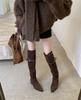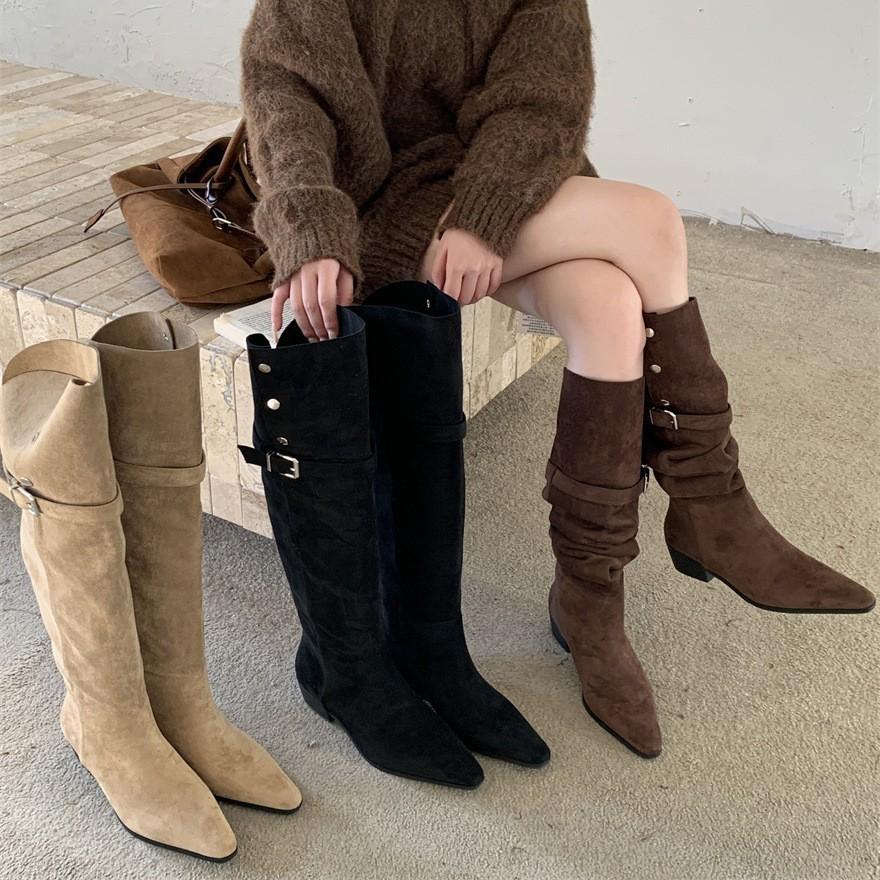 2025 autumn and winter new belt buckle pointed thick heel medium heel boots high boots casual suede over knee boots 2 wear type