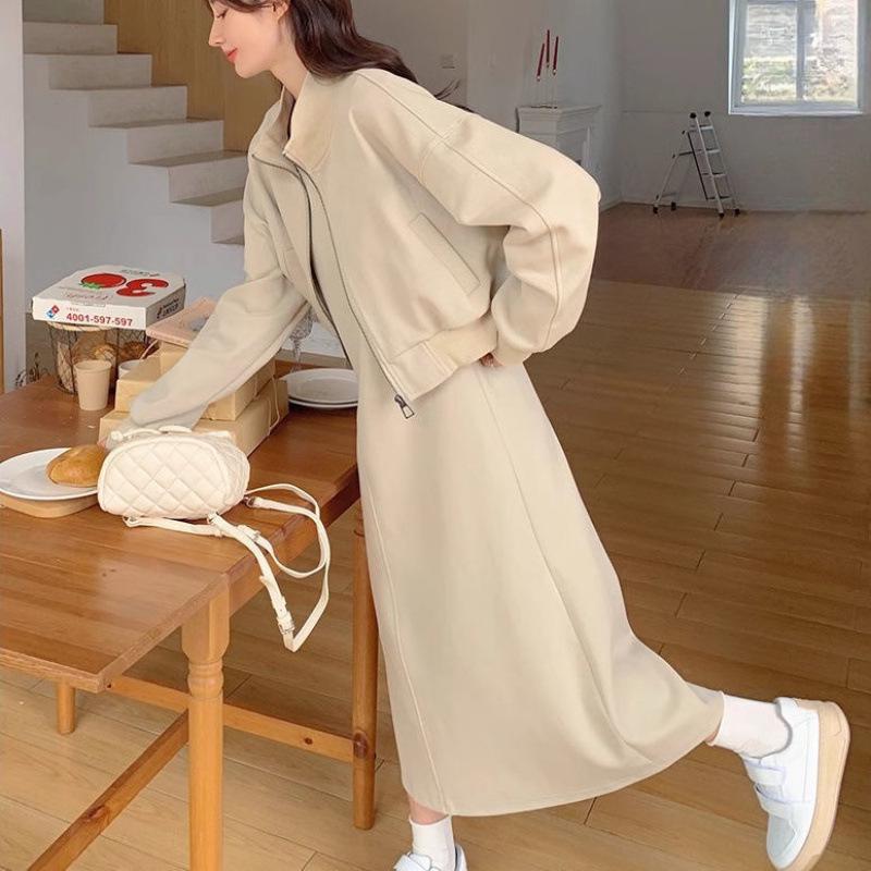 Schickes Übergrößen-Schlankheitsweste- und Kleider-Set - 300 Jin Frühling/Herbst Bauchbedeckendes, altersreduzierendes zweiteiliges Outfit für Damen