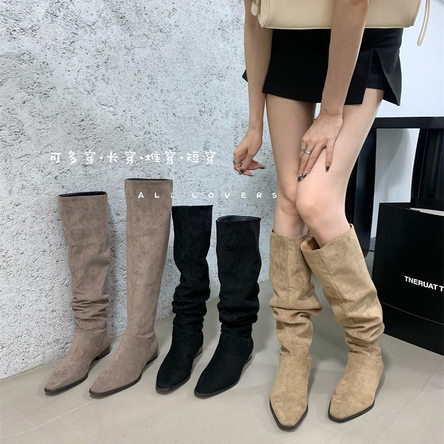 2025 Herbst und Winter Französische Retro Wildleder Stiefeletten mit niedrigem Absatz Damen Stiefel mit dickem Absatz und spitzer Zehenpartie Plissiert Gestapelte hohe Damenstiefel
