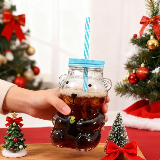 Bären Glas Trinkbecher mit auslaufsicherem Deckel Strohhalm Niedlicher Bären Glasbecher für Saft Milch Tee Smoothies Kreatives Bären-Themen-Trinkgeschirr