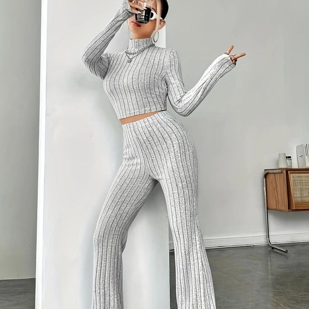 Damen 2025 Einfarbiges Geripptes Strickset: Langarmshirt & Basisshirt