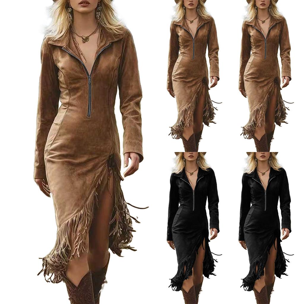 Damenmode Einfarbig Western- Wildleder Fransen Slim-Fit Langarmkleid