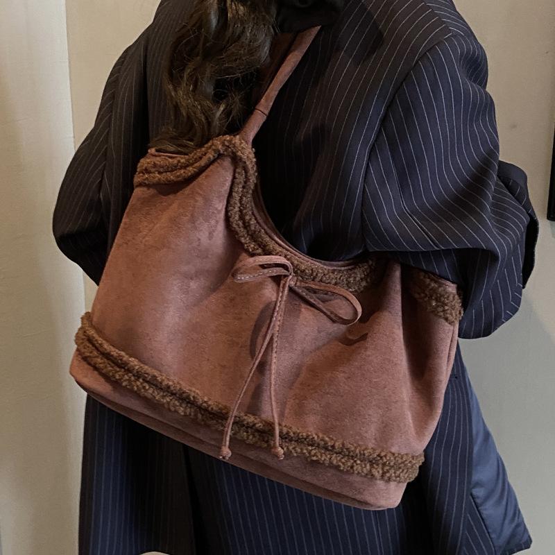 Niche lamb wool splicing underarm bag women's 2025 new bow large-capacity shoulder commuter tote bag