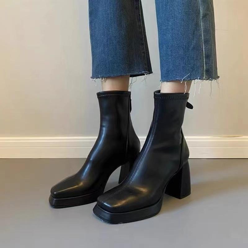 Rindslederversion~ Schwarze kurze Stiefel, Reißverschluss hinten, dicker Absatz erhöht, dünne Damen kleine dünne Stiefel erhöht