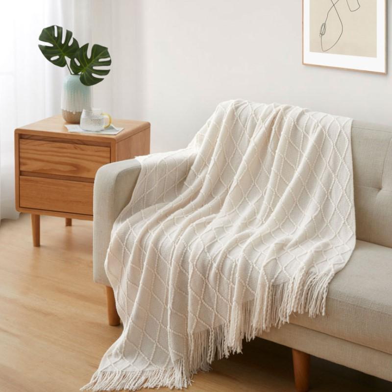 Cream White Boho Blankets Knitted Nordic Sofa Cover Blanket with Tassels Overzised Cozy Textured Farmhouse Vintage Gift Blankets