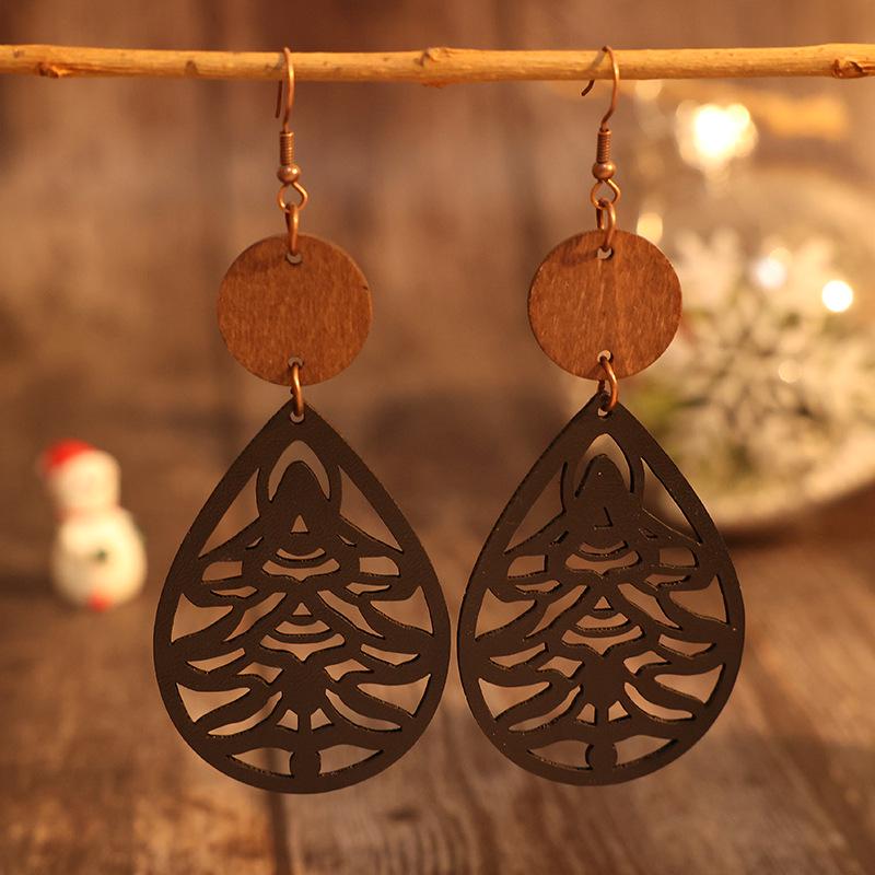 Retro Tropfenförmige Weihnachtsbaum Lederohrringe mit Holzchip-Akzenten