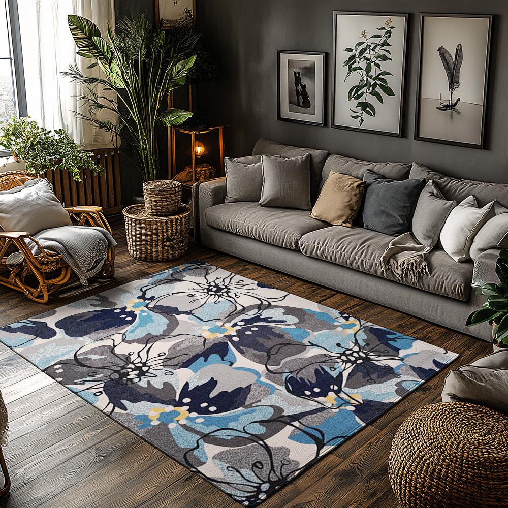 Blue Gray Floral Bohemian Rug, Modern Pattern Non-Slip Carpet, Soft Living Room Mat for Natural Home Decor