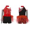Mädchen Jazz Tanzkostüm Glitzerndes Paillettenoberteil mit Feder-Tüllrock Asymmetrischer Colorblock Jumpsuit für Bühnenauftritt