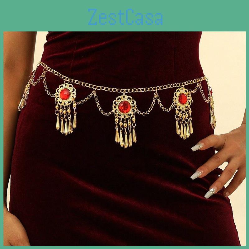 Red Bohemian Ethnic Acrylic Gemstone Fringe Waist Chain With Flower Pendant