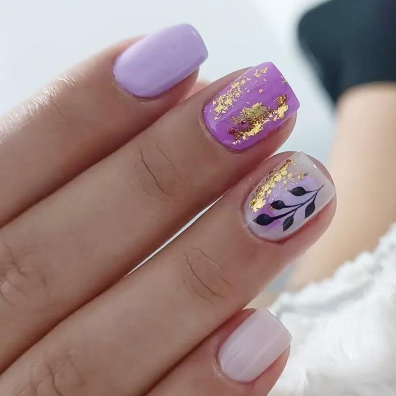 Glitterys Short False Nail 24Pcs Winter Collection Purple Gold Leaf Design Easy Application ABS Material Holiday Nail Art