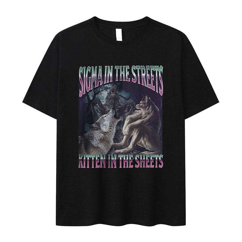 Sigma auf der Straße Kätzchen im Bett Lustiges Werwolf Meme T-Shirt Mann Cringe Werwolf Reißend Gothic Streetwear T-Shirt Männlich