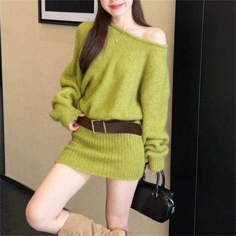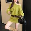 With belt slanted shoulder long sleeve knitted dress women's autumn and winter new fashion pure desire wind waist sweater hip skirt women