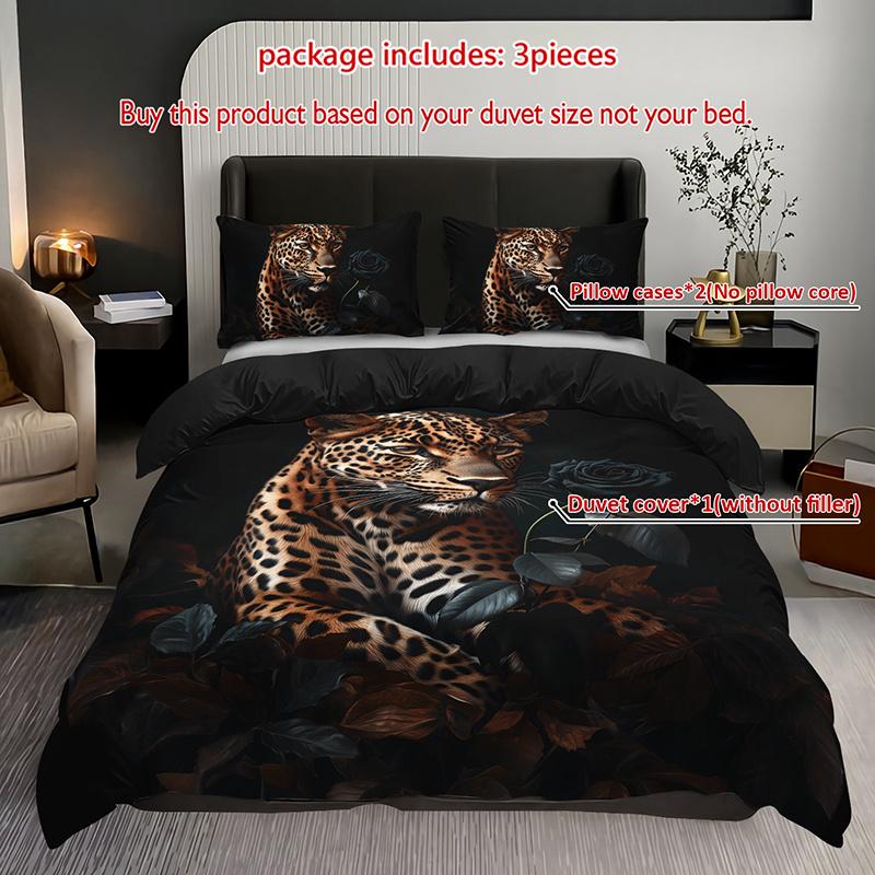 3Pcs Leopard And Black Rose Bedding Duvet Cover Set Luxury Leopard Bedding Quilt Set Animal Themed Bed Quilt Set Elegant