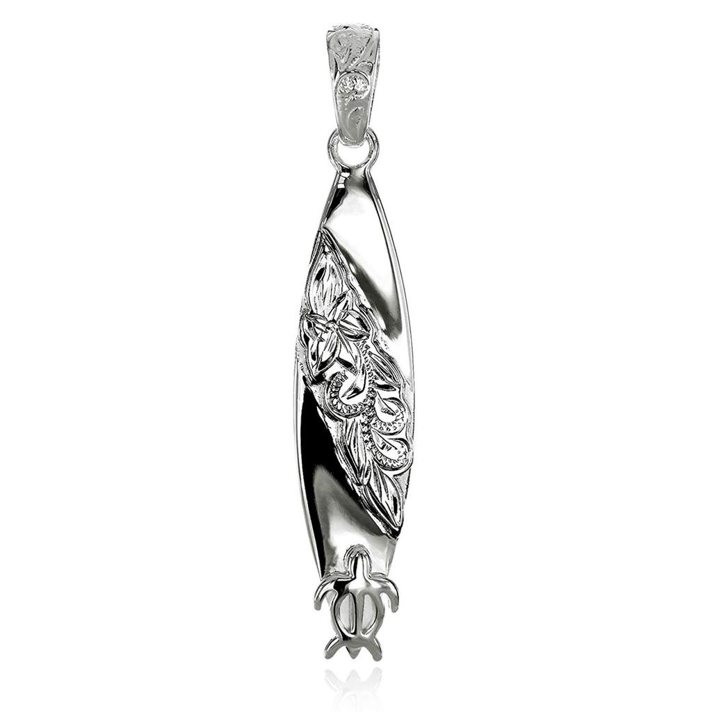 Leilani Hawaiian Jewelry Turtle Honu (Sea Turtle) Plumeria & Scroll (Wave) Carved Surfboard Pendant Necklace for Men, 925 Silver