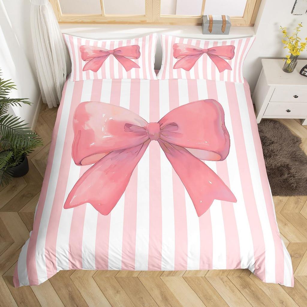 Dreamy Pink Bow Duvet Cover Queen King Size Princess Style Cute Bow Print Suitable For Kids Girls Teens Bedroom Decoration 3 Pcs